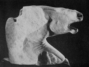 The new acquisition is executed in a fine-grained white marble, now tinged with a golden patina, probably from the quarries on Mount Pentelicon near Athens. The surface of the oblique cut across the neck does not indicate clearly whether the head was once part of a complete figure of a horse or is in itself complete, intended for some special use. The latter seems most likely as the head is pierced by a circular opening through the neck and nose to allow the passage of water. It was undoubtedly used in ancient times as a fountain decoration and it is tempting to think that it once formed part of a large group, perhaps Poseidon rising from the water in his chariot drawn by sea horses spouting water. An alternative is that this head was placed in a somewhat similar group in the triangular pediment of a shrine or temple, after the manner of the Parthenon where the sun god, Helios, drives his horsedrawn chariot upward from the sea, and Selene, Goddess of the Moon, sinks into the sea with her horses, these groups filling the extremities of the triangular pedimental space. The original use of the head in a pedimental group does not actually exclude its later reuse in a fountain.