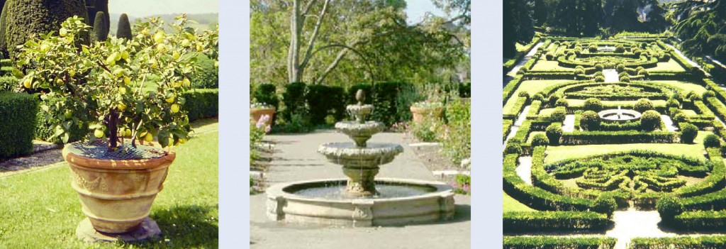 In the 15th century, gardeners rediscovered the art of topiary — pruning boxwood, yews, cypress and ilex trees into geometrical shapes or to form walls of greenery around the parterres. Greenery was trimmed into the shape of battlements or animals to provide theatrical backdrops of foliage or to form intricate mazes and imaginative patterned parterres. Walks bordered with geometrically clipped box bushes created vistas. High hedges formed enclosures called exedras. Also trees were trained to make foliage roofs over walks with interlacing branches — nature was being tamed and bridled. Stone elements began to appear amongst the greenery — grottos made of pumice or tufa covered with sea shells, mossy imitation rocks, fountains, cascades and ornate ponds with sprays and jets, pavements of pebble mosaics and statues adorned the gardens.