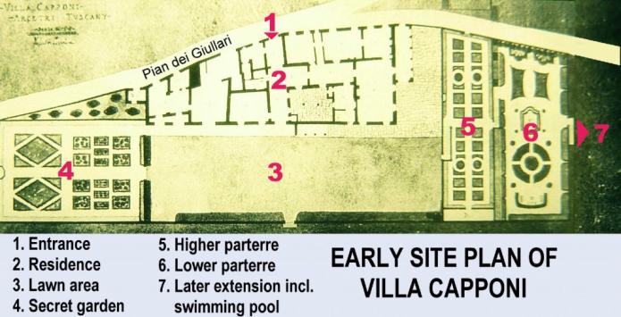 VILLA CAPPONI, is located on Pian dei Giullari at Arcetri, (south of Florence). The villa is not open to the public., but in the past it has occasionally been included on itineraries of Villa and Garden tours of Tuscany.