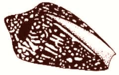 [CONE SHELL]The cone shell or cone snail is actually any of several marine snails of the subclass Prosobranchia (class Gastropoda) that comprise the genus Conus and family Conidae. The shell is 4 to 5 inches (10 to 13 centimeters) long. Usually it is straight sided having a low spire with tapering body whorl, and narrow aperture, or opening into the first whorl in the shell. Cone shell's inject a highly poisonous paralyzing toxin by means of a dartlike mechanism near the tip; a few of the larger species have fatally stung human beings. Their usual prey is worms and mollusks and an occasional small fish. Most species are indigenous to the Indo-Pacific Basin region.